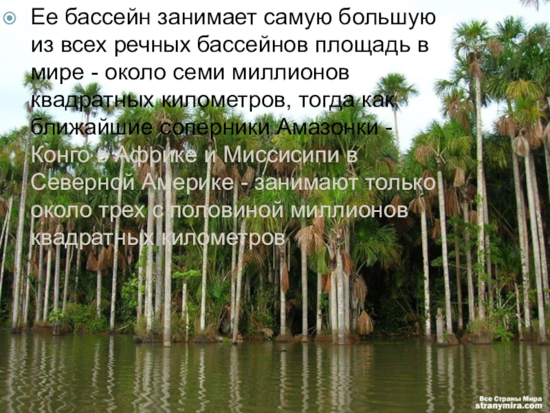 Слайд 7Ее бассейн занимает самую большую из всех речных бассейнов площадь