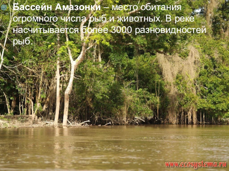 Слайд 13Бассейн Амазонки – место обитания огромного числа рыб и животных.
