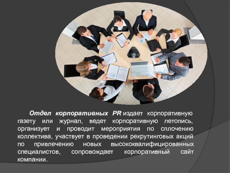 Слайд 13 Отдел корпоративных PR издает корпоративную газету или журнал, ведет корпоративную летопись,