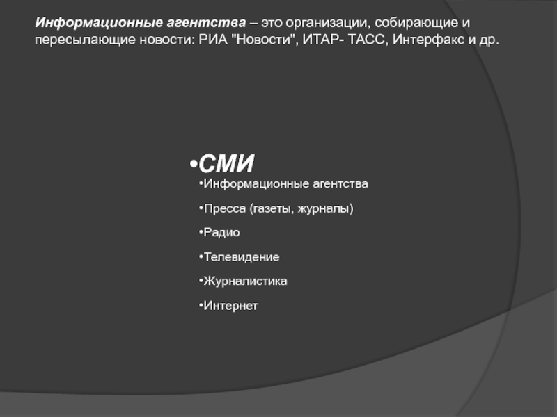 Слайд 21Информационные агентства – это организации, собирающие и пересылающие новости: РИА "Новости",