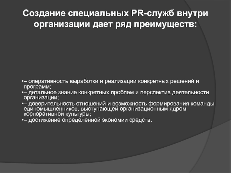Слайд 10Создание специальных PR-служб внутри организации дает ряд преимуществ: