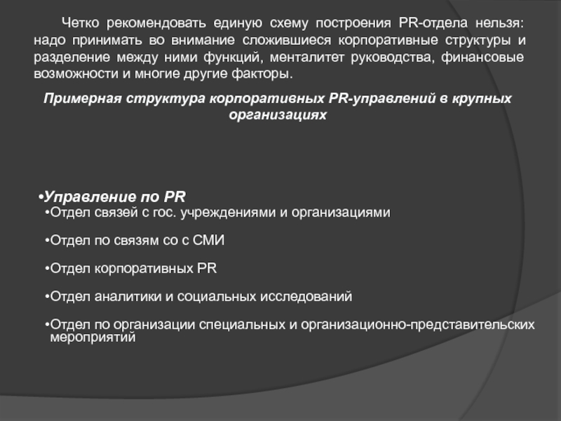 Слайд 12 Четко рекомендовать единую схему построения PR-отдела нельзя: надо принимать во
