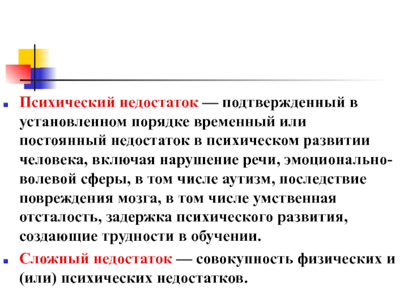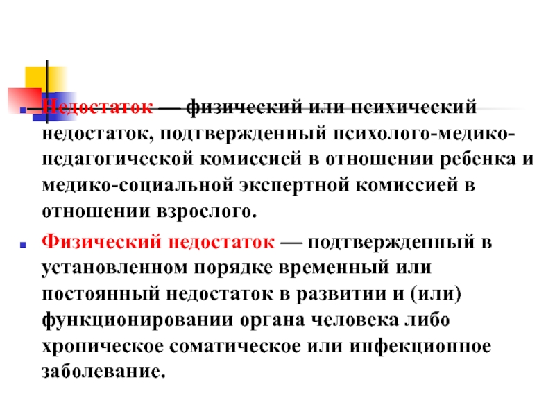 Слайд 23Недостаток — физический или психический недостаток, подтвержденный психолого-медико-педагогической комиссией в