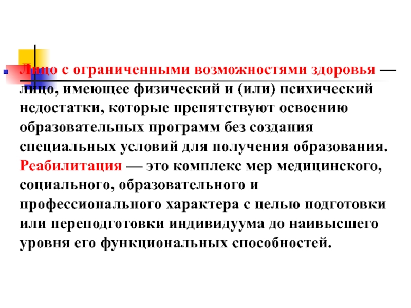 Слайд 22Лицо с ограниченными возможностями здоровья — лицо, имеющее физический и
