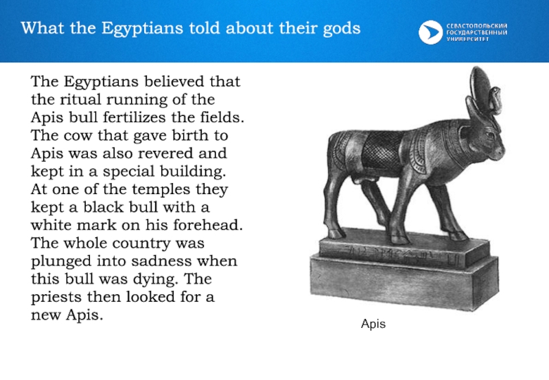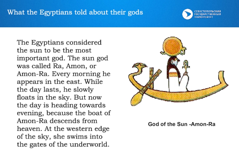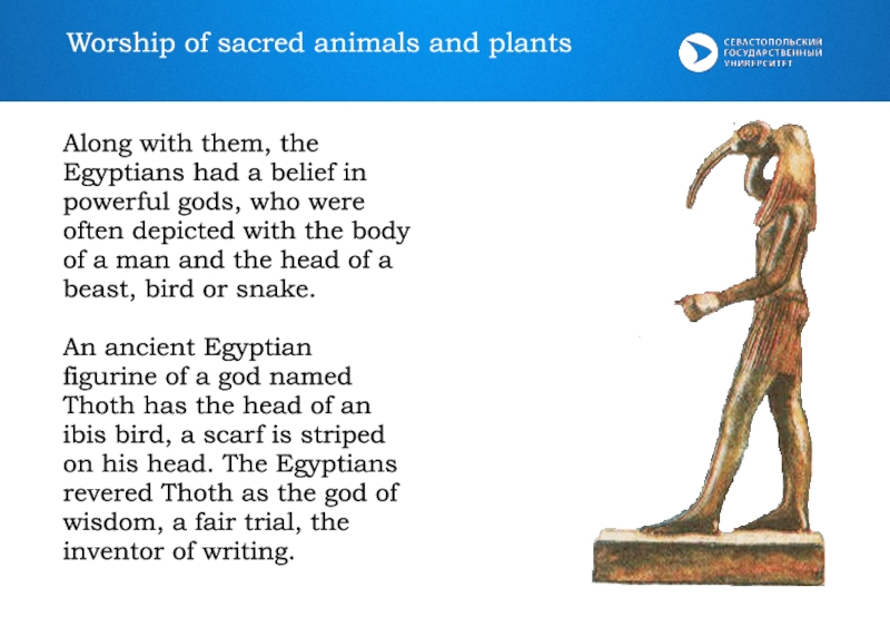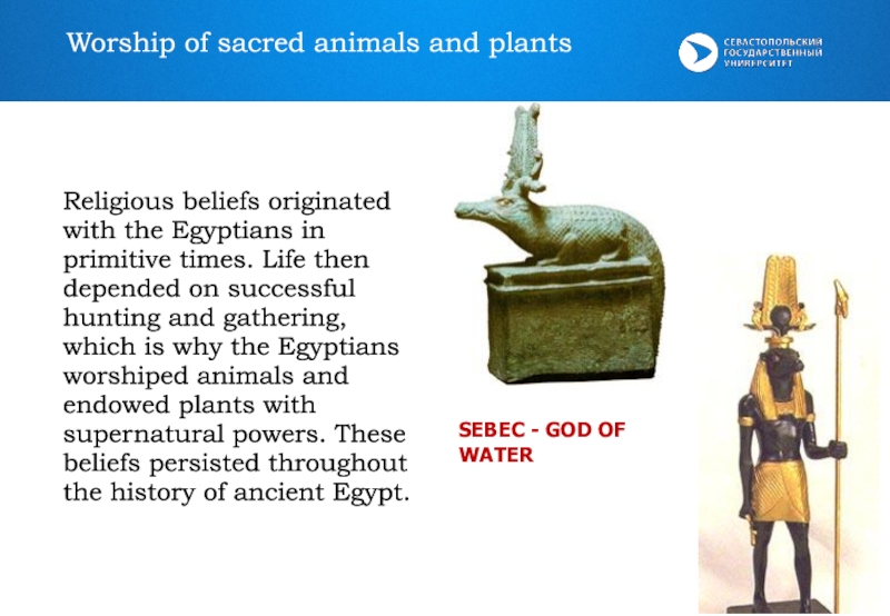 hunting and gathering, which is why the Egyptians worshiped animals and endowed plants with supernatural powers. These beliefs persisted throughout the history of ancient Egypt.SEBEC - GOD OF WATER