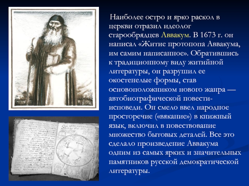 отразил идеолог старообрядцев Аввакум. В 1673 г. он написал «Житие