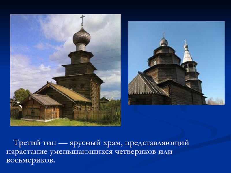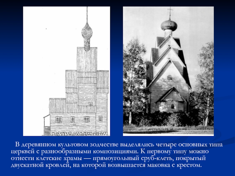 Слайд 10 В деревянном культовом зодчестве выделялись четыре