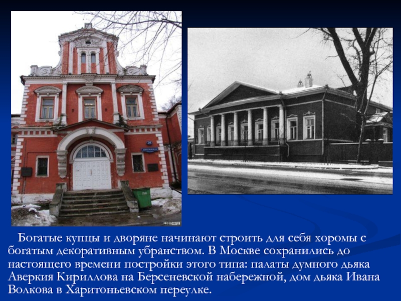 сохранились до настоящего времени постройки этого типа: палаты думного дьяка Аверкия Кириллова на Берсеневской набережной, дом дьяка Ивана Волкова в Харитоньевском переулке.
