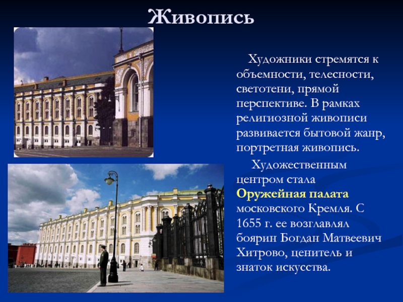 Художественным центром стала Оружейная палата московского Кремля. С 1655 г. ее возглавлял боярин Богдан Матвеевич Хитрово, ценитель и знаток искусства.