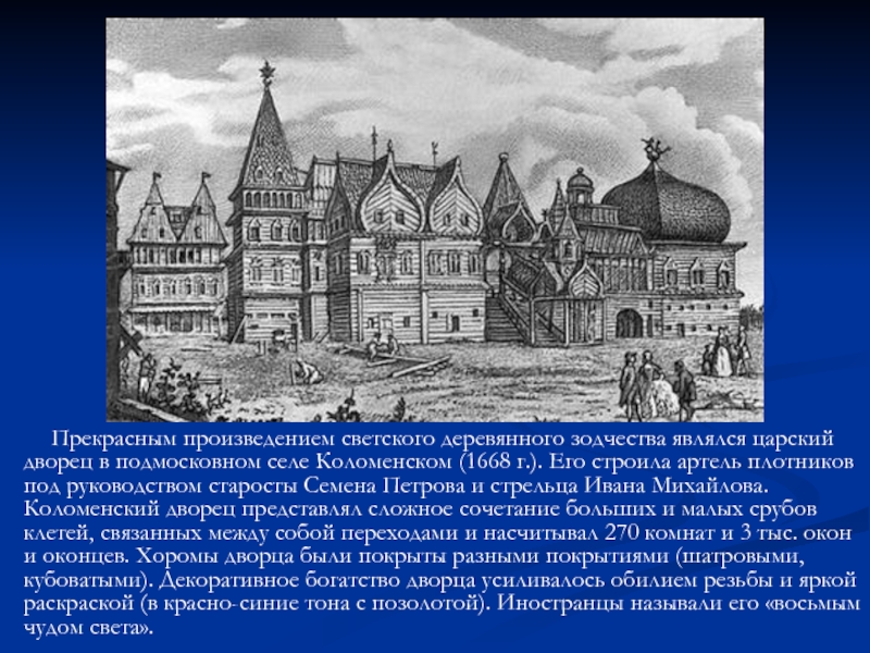 являлся царский дворец в подмосковном селе Коломенском (1668 г.). Его