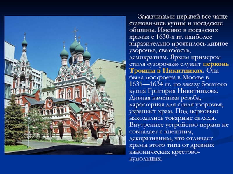 1630-х гг. наиболее выразительно проявилось дивное узорочье, светскость, демократизм. Ярким примером стиля «узорочья» служит церковь Троицы в Никитниках. Она была построена в Москве в 1631—1634 гг. по заказу богатого купца Григория Никитникова. Дивная каменная резьба, характерная для стиля узорочья, украшает храм. Под церковью находились товарные склады. Внутреннее устройство церкви не совпадает с внешним, декоративным, что отличает храмы этого типа от древних канонических крестово-купольных.