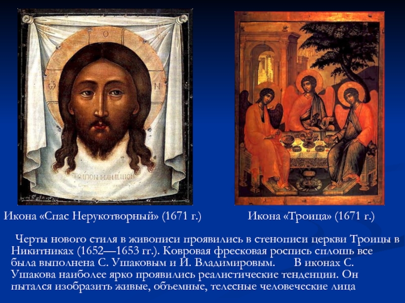 роспись сплошь все была выполнена С. Ушаковым и И. Владимировым. В иконах С. Ушакова наиболее ярко проявились реалистические тенденции. Он пытался изобразить живые, объемные, телесные человеческие лица