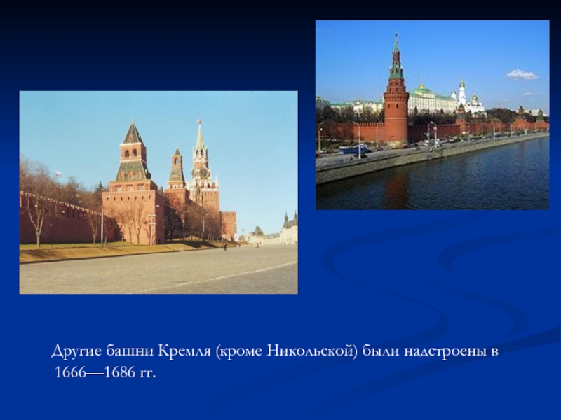 Слайд 6 Другие башни Кремля (кроме Никольской) были надстроены в