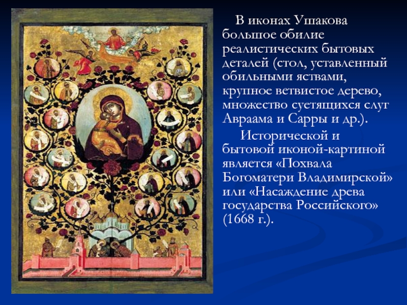 Исторической и бытовой иконой-картиной является «Похвала Богоматери Владимирской» или «Насаждение древа государства Российского» (1668 г.).