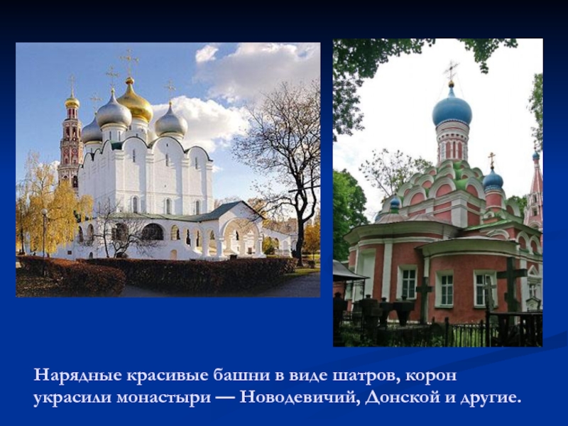Слайд 7Нарядные красивые башни в виде шатров, корон украсили монастыри —