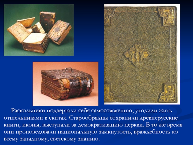 жить отшельниками в скитах. Старообрядцы сохранили древнерусские книги, иконы, выступали