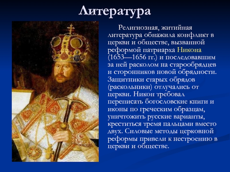 и последовавшим за ней расколом на старообрядцев и сторонников новой обрядности. Защитники старых обрядов (раскольники) отлучались от церкви. Никон требовал переписать богословские книги и иконы по греческим образцам, уничтожить русские варианты, креститься тремя пальцами вместо двух. Силовые методы церковной реформы привели к нестроению в церкви и обществе.
