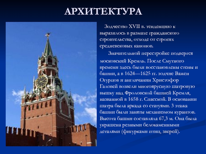 московский Кремль. После Смутного времени здесь были восстановлены стены и башни, а в 1624—1625 гг. зодчие Важен Огурцов и англичанин Христофор Галовей возвели многоярусную шатровую вышку над Фроловской башней Кремля, названной в 1658 г. Спасской. В основании шатра была аркада со статуями. 3 этажа башни были заняты механизмом курантов. Высота башни составляла 67,3 м. Она была украшена резными белокаменными деталями (фигурками птиц, зверей).