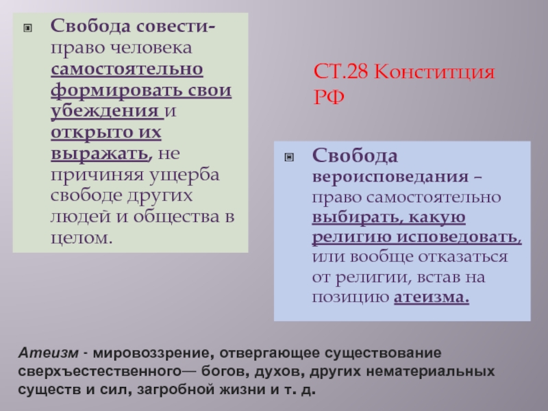 Свобода вероисповедания – право самостоятельно выбирать, какую религию исповедовать, или вообще отказаться от религии, встав на позицию атеизма.