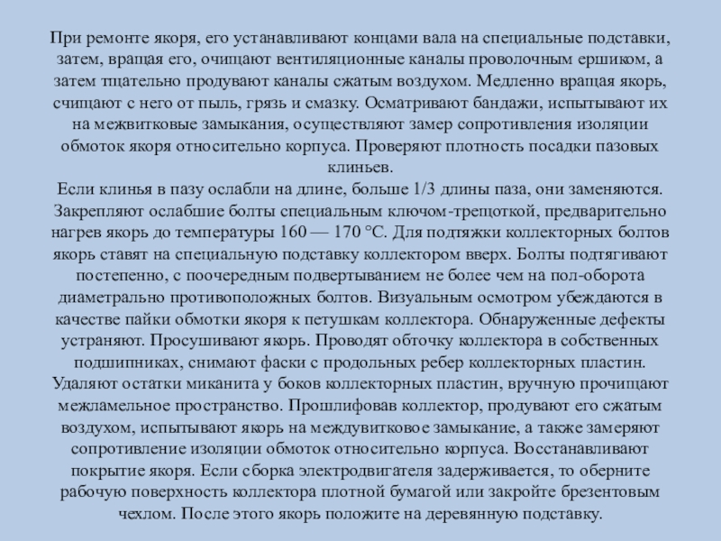 Слайд 19При ремонте якоря, его устанавливают концами вала на специальные подставки,