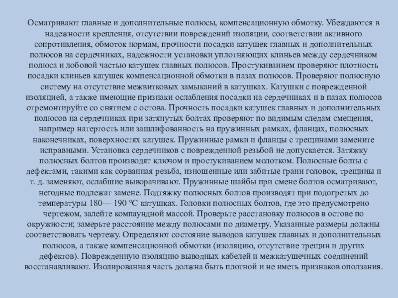 Слайд 14Осматривают главные и дополнительные полюсы, компенсационную обмотку. Убеждаются в надежности