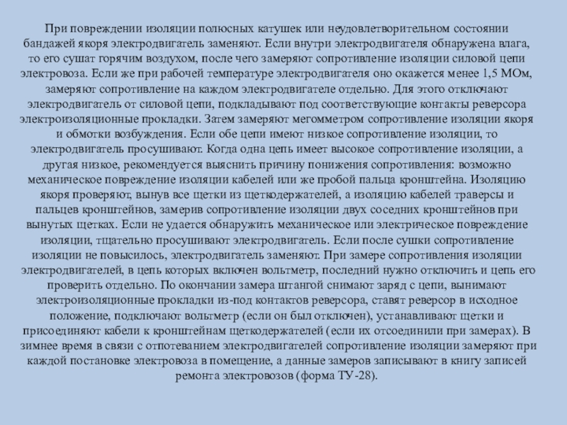горячим воздухом, после чего замеряют сопротивление изоляции силовой цепи электровоза. Если же при рабочей температуре электродвигателя оно окажется менее 1,5 МОм, замеряют сопротивление на каждом электродвигателе отдельно. Для этого отключают электродвигатель от силовой цепи, подкладывают под соответствующие контакты реверсора электроизоляционные прокладки. Затем замеряют мегомметром сопротивление изоляции якоря и обмотки возбуждения. Если обе цепи имеют низкое сопротивление изоляции, то электродвигатель просушивают. Когда одна цепь имеет высокое сопротивление изоляции, а другая низкое, рекомендуется выяснить причину понижения сопротивления: возможно механическое повреждение изоляции кабелей или же пробой пальца кронштейна. Изоляцию якоря проверяют, вынув все щетки из щеткодержателей, а изоляцию кабелей траверсы и пальцев кронштейнов, замерив сопротивление изоляции двух соседних кронштейнов при вынутых щетках. Если не удается обнаружить механическое или электрическое повреждение изоляции, тщательно просушивают электродвигатель. Если после сушки сопротивление изоляции не повысилось, электродвигатель заменяют. При замере сопротивления изоляции электродвигателей, в цепь которых включен вольтметр, последний нужно отключить и цепь его проверить отдельно. По окончании замера штангой снимают заряд с цепи, вынимают электроизоляционные прокладки из-под контактов реверсора, ставят реверсор в исходное положение, подключают вольтметр (если он был отключен), устанавливают щетки и присоединяют кабели к кронштейнам щеткодержателей (если их отсоединили при замерах). В зимнее время в связи с отпотеванием электродвигателей сопротивление изоляции замеряют при каждой постановке электровоза в помещение, а данные замеров записывают в книгу записей ремонта электровозов (форма ТУ-28).