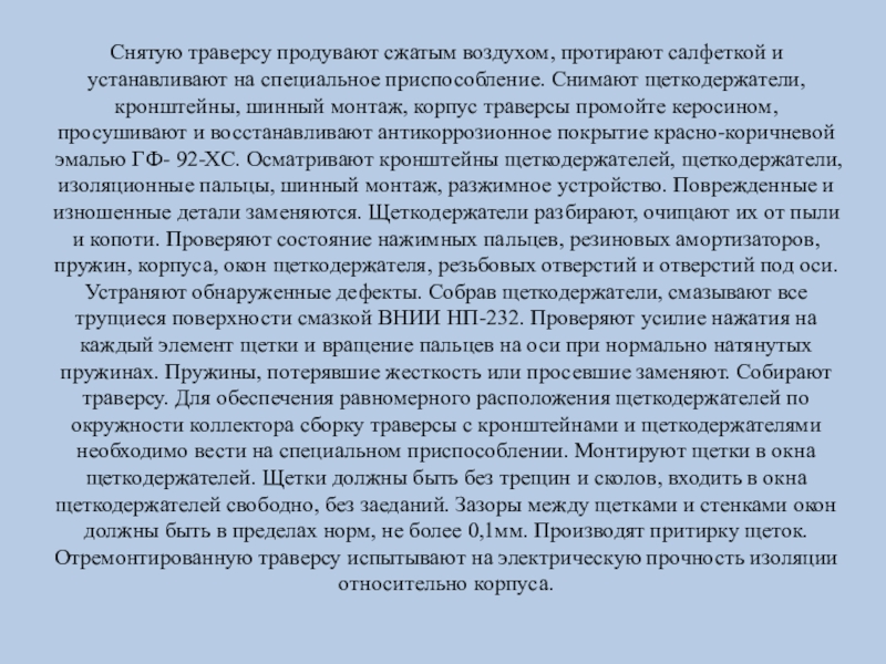 керосином, просушивают и восстанавливают антикоррозионное покрытие красно-коричневой эмалью ГФ- 92-ХС. Осматривают кронштейны щеткодержателей, щеткодержатели, изоляционные пальцы, шинный монтаж, разжимное устройство. Поврежденные и изношенные детали заменяются. Щеткодержатели разбирают, очищают их от пыли и копоти. Проверяют состояние нажимных пальцев, резиновых амортизаторов, пружин, корпуса, окон щеткодержателя, резьбовых отверстий и отверстий под оси. Устраняют обнаруженные дефекты. Собрав щеткодержатели, смазывают все трущиеся поверхности смазкой ВНИИ НП-232. Проверяют усилие нажатия на каждый элемент щетки и вращение пальцев на оси при нормально натянутых пружинах. Пружины, потерявшие жесткость или просевшие заменяют. Собирают траверсу. Для обеспечения равномерного расположения щеткодержателей по окружности коллектора сборку траверсы с кронштейнами и щеткодержателями необходимо вести на специальном приспособлении. Монтируют щетки в окна щеткодержателей. Щетки должны быть без трещин и сколов, входить в окна щеткодержателей свободно, без заеданий. Зазоры между щетками и стенками окон должны быть в пределах норм, не более 0,1мм. Производят притирку щеток. Отремонтированную траверсу испытывают на электрическую прочность изоляции относительно корпуса.