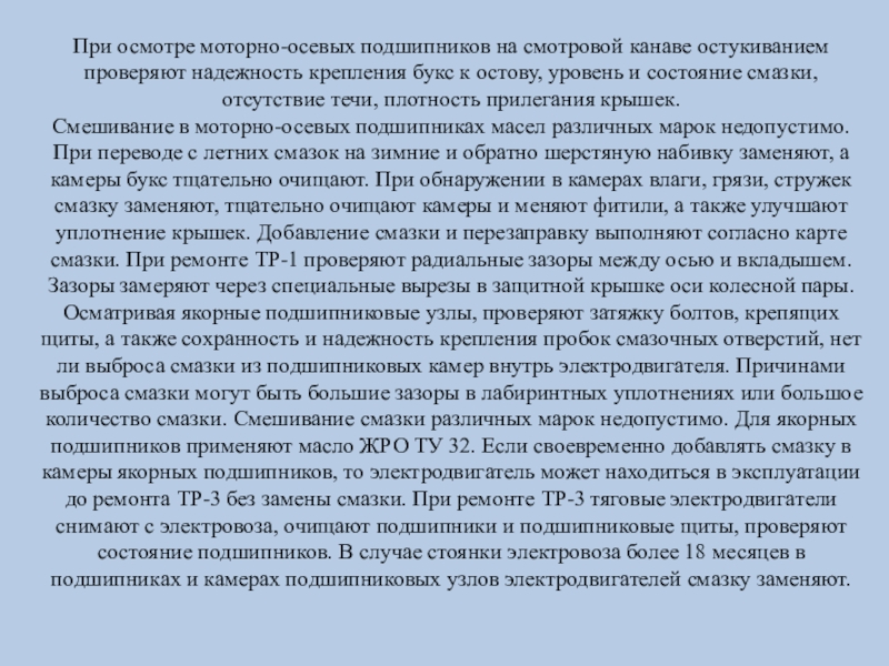 Смешивание в моторно-осевых подшипниках масел различных марок недопустимо. При переводе с летних смазок на зимние и обратно шерстяную набивку заменяют, а камеры букс тщательно очищают. При обнаружении в камерах влаги, грязи, стружек смазку заменяют, тщательно очищают камеры и меняют фитили, а также улучшают уплотнение крышек. Добавление смазки и перезаправку выполняют согласно карте смазки. При ремонте ТР-1 проверяют радиальные зазоры между осью и вкладышем. Зазоры замеряют через специальные вырезы в защитной крышке оси колесной пары. Осматривая якорные подшипниковые узлы, проверяют затяжку болтов, крепящих щиты, а также сохранность и надежность крепления пробок смазочных отверстий, нет ли выброса смазки из подшипниковых камер внутрь электродвигателя. Причинами выброса смазки могут быть большие зазоры в лабиринтных уплотнениях или большое количество смазки. Смешивание смазки различных марок недопустимо. Для якорных подшипников применяют масло ЖРО ТУ 32. Если своевременно добавлять смазку в камеры якорных подшипников, то электродвигатель может находиться в эксплуатации до ремонта ТР-3 без замены смазки. При ремонте ТР-3 тяговые электродвигатели снимают с электровоза, очищают подшипники и подшипниковые щиты, проверяют состояние подшипников. В случае стоянки электровоза более 18 месяцев в подшипниках и камерах подшипниковых узлов электродвигателей смазку заменяют.