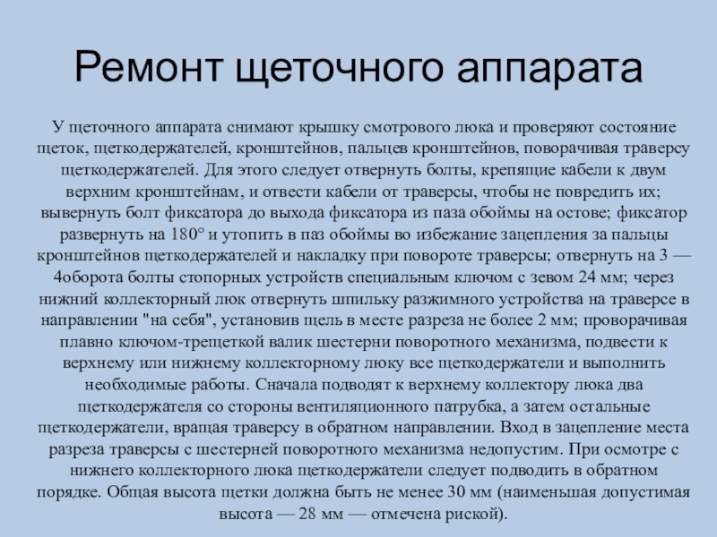 щеткодержателей. Для этого следует отвернуть болты, крепящие кабели к двум верхним кронштейнам, и отвести кабели от траверсы, чтобы не повредить их; вывернуть болт фиксатора до выхода фиксатора из паза обоймы на остове; фиксатор развернуть на 180° и утопить в паз обоймы во избежание зацепления за пальцы кронштейнов щеткодержателей и накладку при повороте траверсы; отвернуть на 3 — 4оборота болты стопорных устройств специальным ключом с зевом 24 мм; через нижний коллекторный люк отвернуть шпильку разжимного устройства на траверсе в направлении "на себя", установив щель в месте разреза не более 2 мм; проворачивая плавно ключом-трещеткой валик шестерни поворотного механизма, подвести к верхнему или нижнему коллекторному люку все щеткодержатели и выполнить необходимые работы. Сначала подводят к верхнему коллектору люка два щеткодержателя со стороны вентиляционного патрубка, а затем остальные щеткодержатели, вращая траверсу в обратном направлении. Вход в зацепление места разреза траверсы с шестерней поворотного механизма недопустим. При осмотре с нижнего коллекторного люка щеткодержатели следует подводить в обратном порядке. Общая высота щетки должна быть не менее 30 мм (наименьшая допустимая высота — 28 мм — отмечена риской).