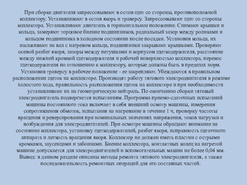 стороны коллектора. Устанавливают двигатель в горизонтальное положение. Снимают крышки и кольца, замеряют торцовое биение подшипников, радиальный зазор между роликами и кольцом подшипника в холодном состоянии после посадки. Установив кольца, их насаживают на вал с нагревом кольца, подшипники закрывают крышками. Проверяют осевой разбег якоря, зазоры между петушками и корпусом щеткодержателя, расстояние между нижней кромкой щеткодержателя и рабочей поверхностью коллектора, перекос щеткодержателя по отношению к коллектору, которые должны быть в пределах норм. Установив траверсу в рабочее положение - ее закрепляют. Убеждаются в правильном расположении щеток на коллекторе. Производят работу тягового электродвигателя в режиме холостого хода, правильность расположения щеток на коллекторе и при необходимости устанавливают их на геометрическую нейтраль. По окончанию сборки тяговый электродвигатель подвергается испытаниям. Программа приемо-сдаточных испытаний машины постоянного тока включает в себя внешний осмотр машины, измерения сопротивления обмоток, испытания на нагревание в течение 1 ч, проверку частоты вращения и реверсирования при номинальных значениях напряжения, токов нагрузки и возбуждения для электродвигателей. При осмотре машины обращают внимание на состояние коллектора, установку щеткодержателей, разбег якоря, исправность щеточного аппарата и легкость вращения якоря. Коллектор не должен иметь пластин с острыми кромками, заусенцами и забоинами. Биение коллектора, контактных колец на нагретой машине допускается для электродвигателей и вспомогательных машин не более 0,04 мм.