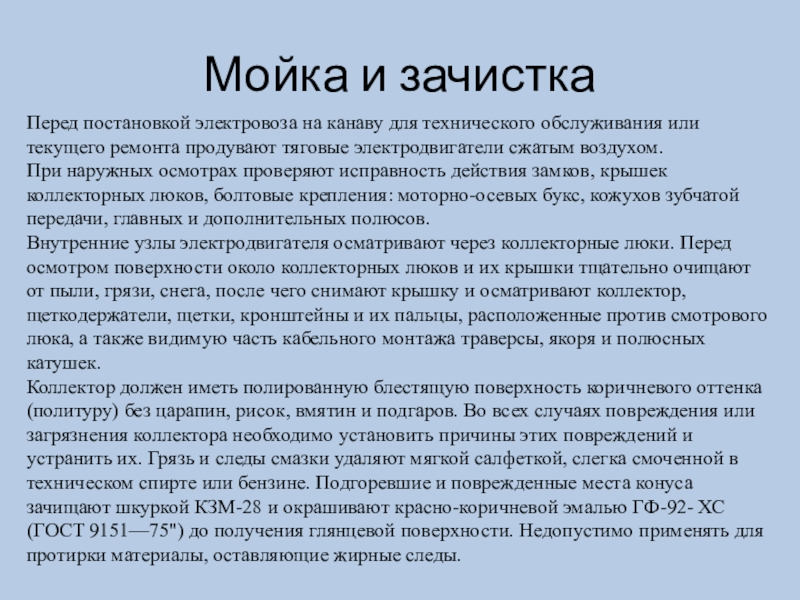 Коллектор должен иметь полированную блестящую поверхность коричневого оттенка (политуру) без царапин, рисок, вмятин и подгаров. Во всех случаях повреждения или загрязнения коллектора необходимо установить причины этих повреждений и устранить их. Грязь и следы смазки удаляют мягкой салфеткой, слегка смоченной в техническом спирте или бензине. Подгоревшие и поврежденные места конуса зачищают шкуркой КЗМ-28 и окрашивают красно-коричневой эмалью ГФ-92- ХС (ГОСТ 9151—75") до получения глянцевой поверхности. Недопустимо применять для протирки материалы, оставляющие жирные следы.