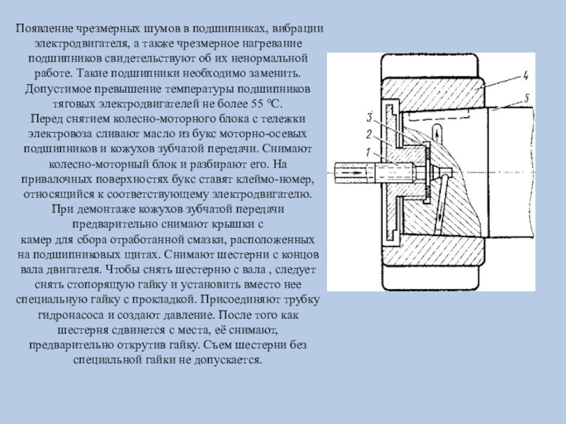 камер для сбора отработанной смазки, расположенных на подшипниковых щитах. Снимают шестерни с концов вала двигателя. Чтобы снять шестерню с вала , следует снять стопорящую гайку и установить вместо нее специальную гайку с прокладкой. Присоединяют трубку гидронасоса и создают давление. После того как шестерня сдвинется с места, её снимают, предварительно открутив гайку. Съем шестерни без специальной гайки не допускается.