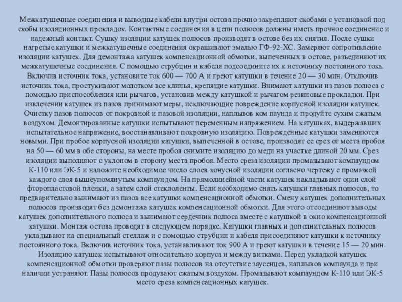 полюсов должны иметь прочное соединение и надежный контакт. Сушку изоляции катушек полюсов производят в остове без их снятия. После сушки нагретые катушки и межкатушечные соединения окрашивают эмалью ГФ-92-ХС. Замеряют сопротивление изоляции катушек. Для демонтажа катушек компенсационной обмотки, выпеченных в остове, разъединяют их межкатушечные соединения. С помощью струбцин и кабеля подсоедините их к источнику постоянного тока. Включив источник тока, установите ток 600 — 700 А и греют катушки в течение 20 — 30 мин. Отключив источник тока, простукивают молотком все клинья, крепящие катушки. Внимают катушки из пазов полюса с помощью приспособления или рычагов, установив между катушкой и рычагом резиновые прокладки. При извлечении катушек из пазов принимают меры, исключающие повреждение корпусной изоляции катушек. Очистку пазов полюсов от покровной и пазовой изоляции, наплывов ком паунда и продуйте сухим сжатым воздухом. Демонтированные катушки испытывают переменным напряжением. На катушках, выдержавших испытательное напряжение, восстанавливают покровную изоляцию. Поврежденные катушки заменяются новыми. При пробое корпусной изоляции катушки, выпеченной в остове, производят ее срез от места пробоя на 50 — 60 мм в обе стороны, на месте пробоя снимите изоляцию до меди на участке длиной 20 мм. Срез изоляции выполняют с уклоном в сторону места пробоя. Место среза изоляции промазывают компаундом К-110 или ЭК-5 и наложите необходимое число слоев конусной изоляции согласно чертежу с промазкой каждого слоя вышеупомянутым компаундом. На прямолинейной части катушек накладывают один слой фторопластовой пленки, а затем слой стеклоленты. Если необходимо снять катушки главных полюсов, то предварительно вынимают из пазов все катушки компенсационной обмотки. Смену катушек дополнительных полюсов производят без демонтажа катушек компенсационной обмотки. Для этого отсоединяют выводы катушек дополнительного полюса и вынимают сердечник полюса вместе с катушкой в окно компенсационной катушки. Монтаж остова проводят в следующем порядке. Катушки главных и дополнительных полюсов укладывают на специальный стеллаж и с помощью струбцин и кабеля присоединяют катушки к источнику постоянного тока. Включив источник тока, устанавливают ток 900 А и греют катушки в течение 15 — 20 мин. Изоляцию катушек испытывают относительно корпуса и между витками. Перед укладкой катушек компенсационной обмотки проверяют пазы полюсов на отсутствие заусенцев, наплывов компаунда и при наличии устраняют. Пазы полюсов продувают сжатым воздухом. Промазывают компаундом К-110 или ЭК-5 место среза компенсационных катушек.