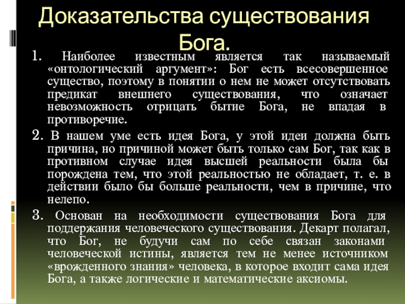 3. Основан на необходимости существования Бога для поддержания человеческого существования. Декарт полагал, что Бог, не будучи сам по себе связан законами человеческой истины, является тем не менее источником «врожденного знания» человека, в которое входит сама идея Бога, а также логические и математические аксиомы.
