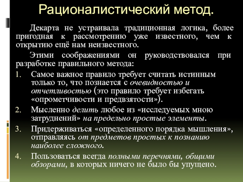 Декарта не устраивала традиционная логика, более пригодная к рассмотрению