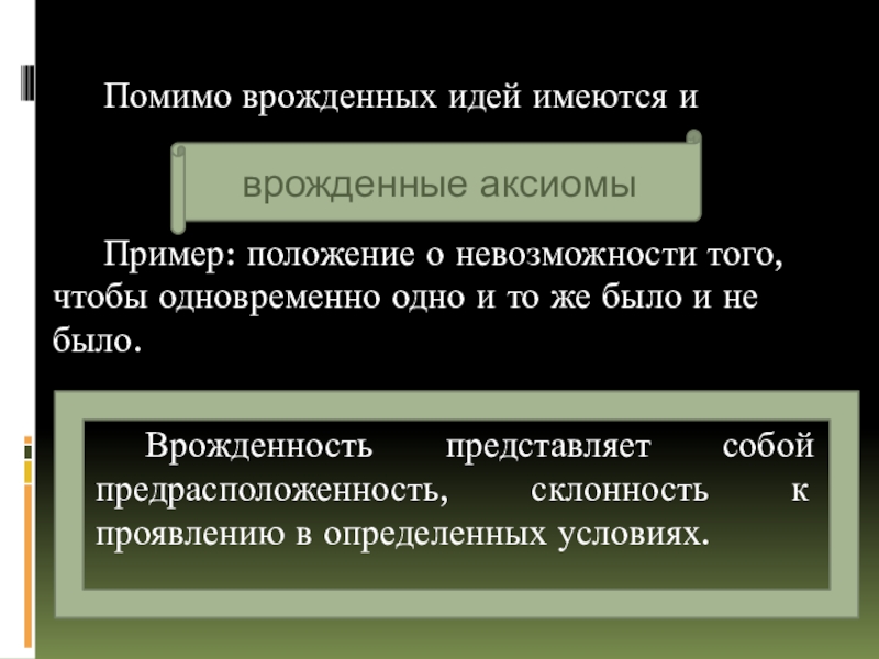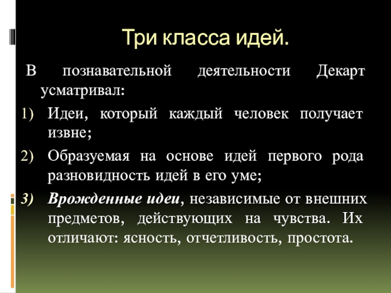 Врожденные идеи, независимые от внешних предметов, действующих на чувства. Их отличают: ясность, отчетливость, простота.