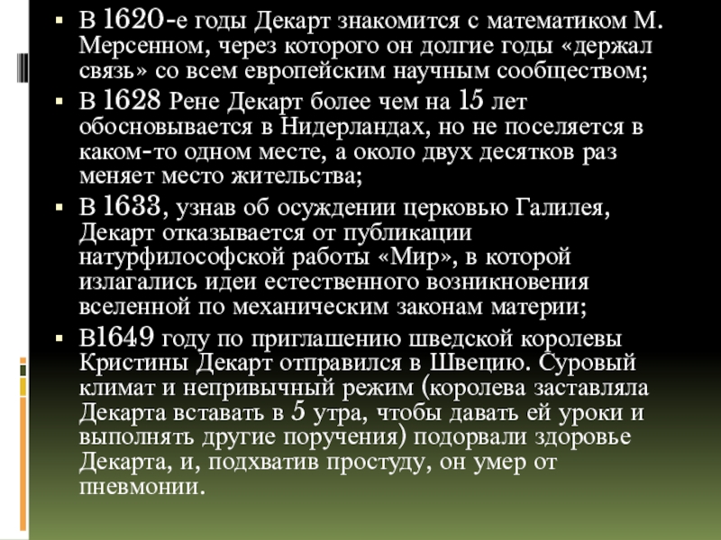 Слайд 6В 1620-е годы Декарт знакомится с математиком М. Мерсенном, через