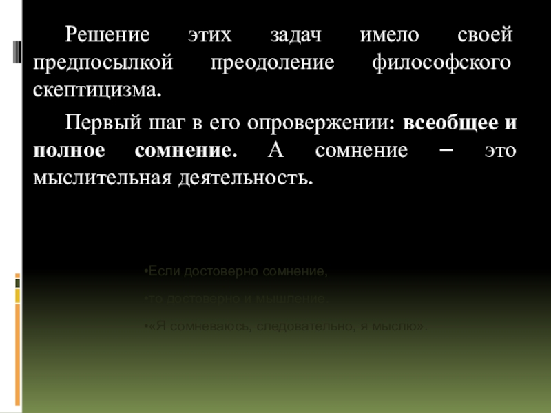 Слайд 21Решение этих задач имело своей предпосылкой преодоление философского скептицизма.