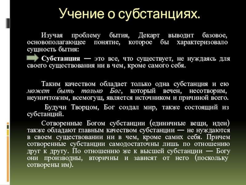 Изучая проблему бытия, Декарт выводит базовое, основополагающее понятие,