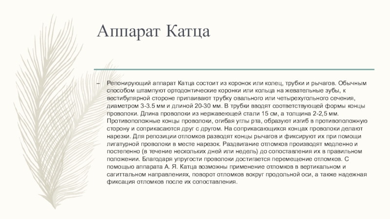 жевательные зубы, к вестибулярной стороне припаивают трубку овального или четырехугольного сечения, диаметром 3-3.5 мм и длиной 20-30 мм. В трубки вводят соответствующей формы концы проволоки. Длина проволоки из нержавеющей стали 15 см, а толщина 2-2,5 мм. Противоположные концы проволоки, огибая углы рта, образуют изгиб в противоположную сторону и соприкасаются друг с другом. На соприкасающихся концах проволоки делают нарезки. Для репозиции отломков разводят концы рычагов и фиксируют их при помощи лигатурной проволоки в месте нарезок. Раздвигание отломков производят медленно и постепенно (в течение нескольких дней или недель) до сопоставления их в правильном положении. Благодаря упругости проволоки достигается перемещение отломков. С помощью аппарата А. Я. Катца возможны применение отломков в вертикальном и сагиттальном направлениях, поворот отломков вокруг продольной оси, а также надежная фиксация отломков после их сопоставления.