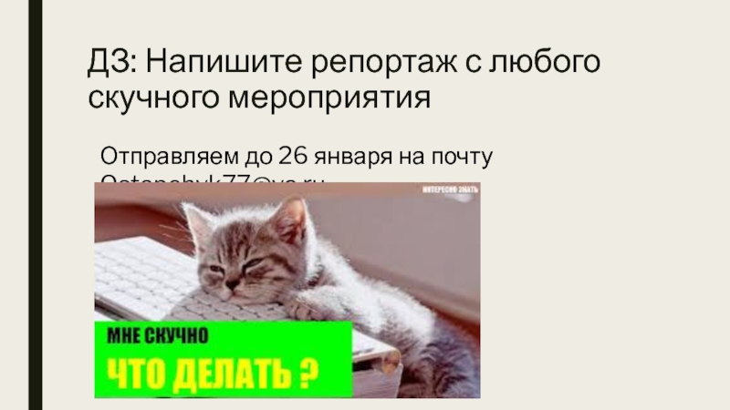 Если не удалось найти и скачать доклад-презентацию, Вы можете заказать его на нашем сайте. Мы постараемся найти нужный Вам материал и отправим по электронной почте. Не стесняйтесь обращаться к нам, если у вас возникли вопросы или пожелания: