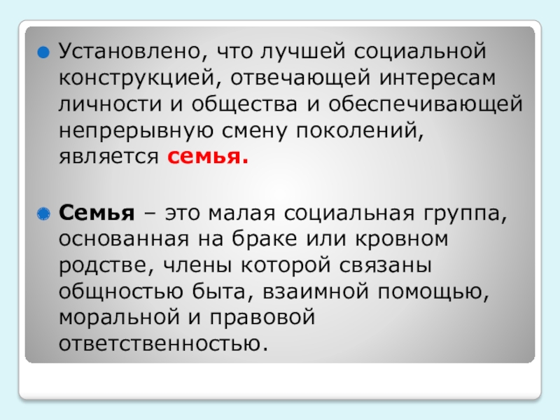 Установлено, что лучшей социальной конструкцией, отвечающей интересам личности и общества и обеспечивающей непрерывную смену поколений, является семья.Семья