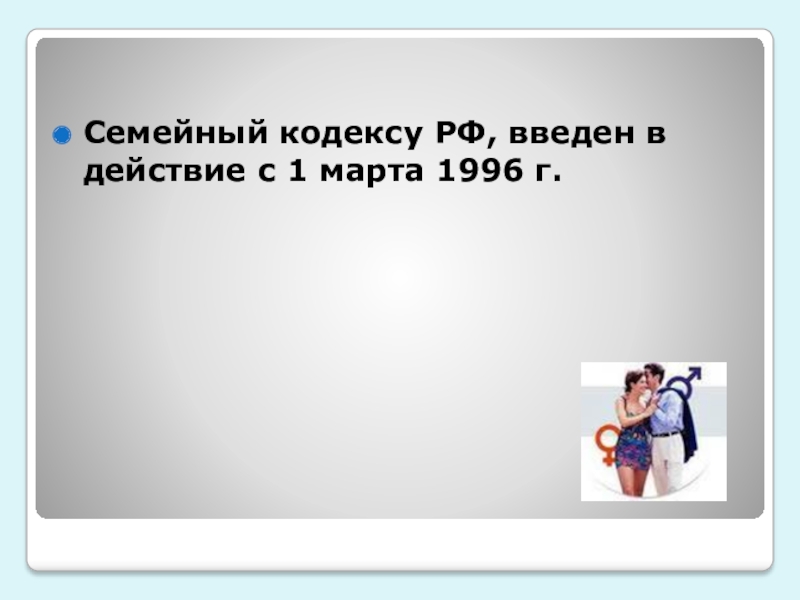 Слайд 5Семейный кодексу РФ, введен в действие с 1 марта 1996