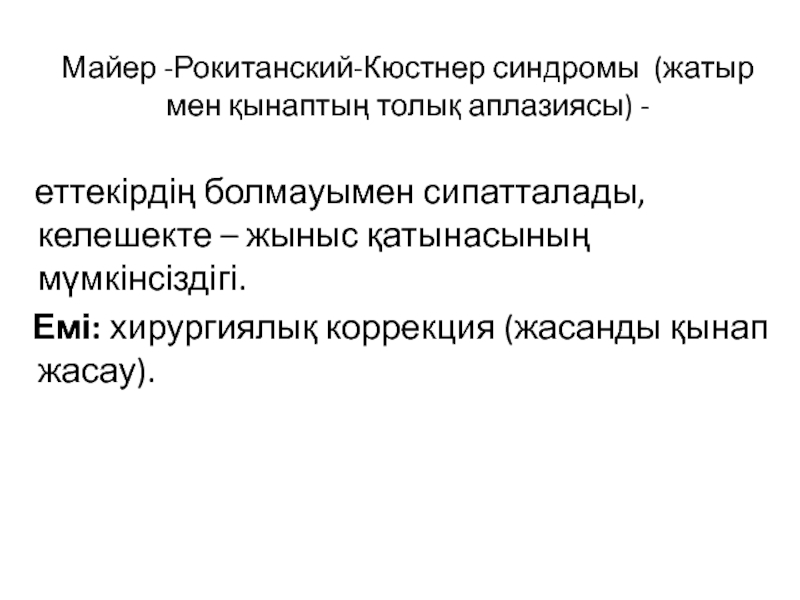 Слайд 47Майер -Рокитанский-Кюстнер синдромы (жатыр мен қынаптың толық аплазиясы) -