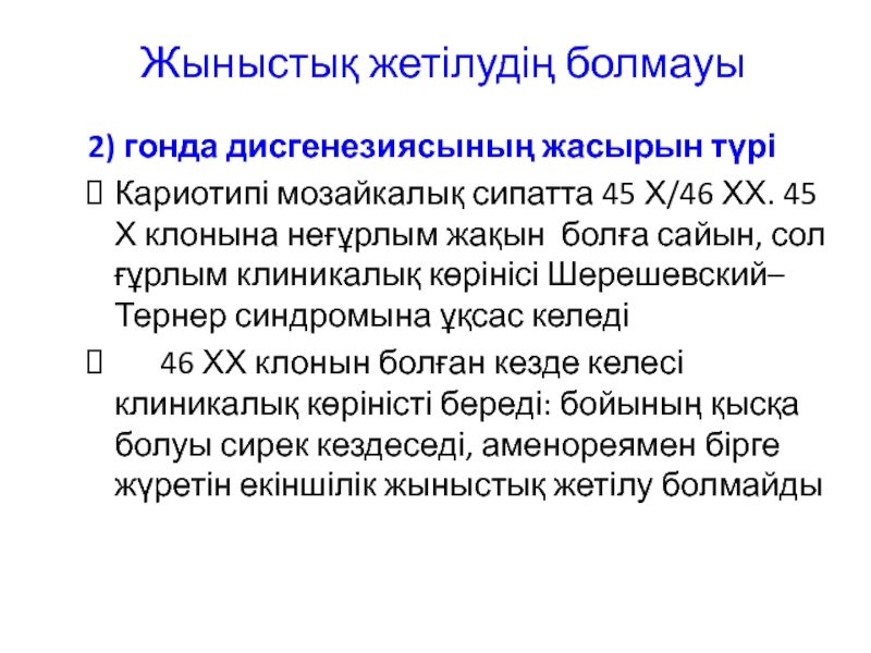 46 ХХ клонын болған кезде келесі клиникалық көріністі береді: бойының қысқа болуы сирек кездеседі, аменореямен бірге жүретін екіншілік жыныстық жетілу болмайды
