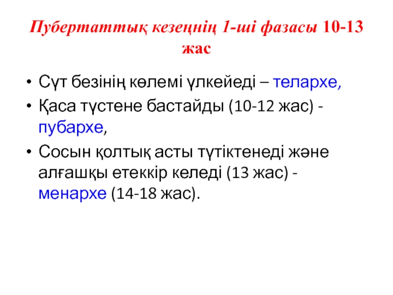 ▪ пубертаттық кезеңнің бірінші фаза сы 10-13 жас,