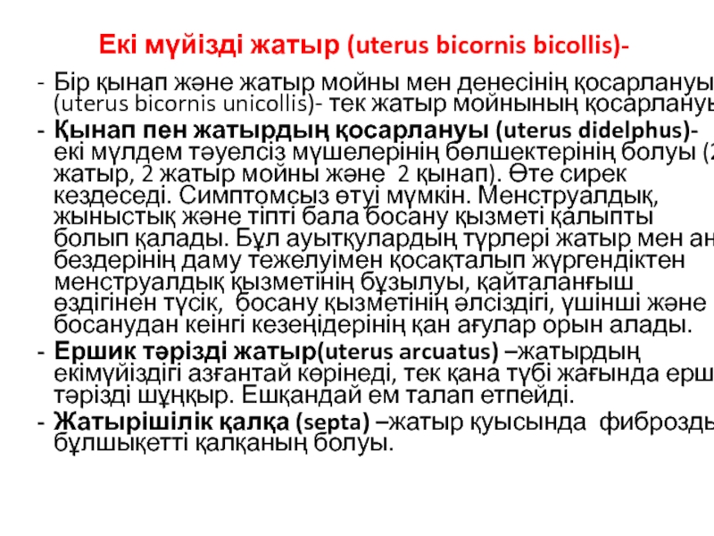 мен денесінің қосарлануы; (uterus bicornis unicollis)- тек жатыр мойнының қосарлануы.