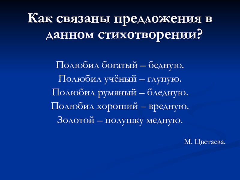 Как связаны предложения в данном стихотворении?Полюбил богатый – бедную.Полюбил учёный – глупую.Полюбил румяный – бледную.Полюбил хороший –