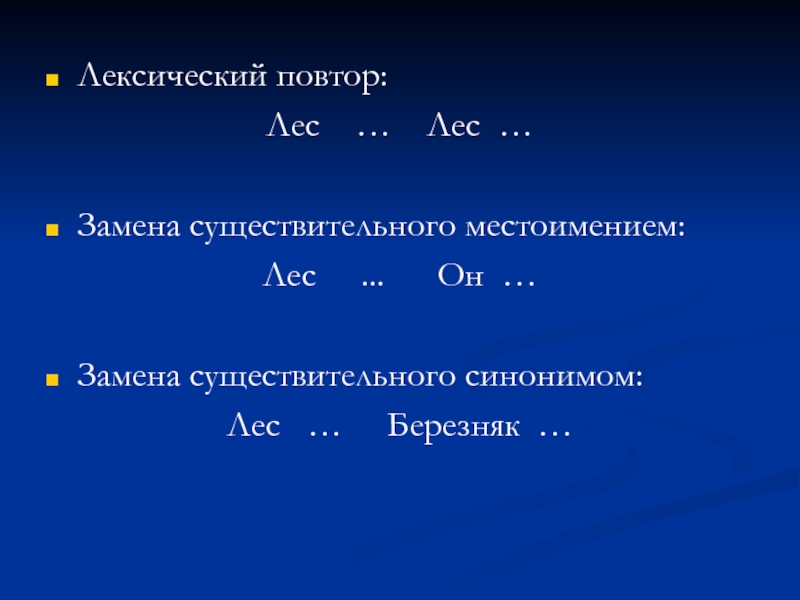 Лексический повтор:Лес  …  Лес …Замена существительного местоимением:Лес   ...   Он …Замена существительного
