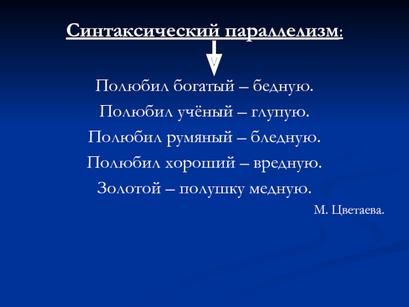 Синтаксический параллелизм:Полюбил богатый – бедную.Полюбил учёный – глупую.Полюбил румяный – бледную.Полюбил хороший – вредную.Золотой – полушку медную.М.